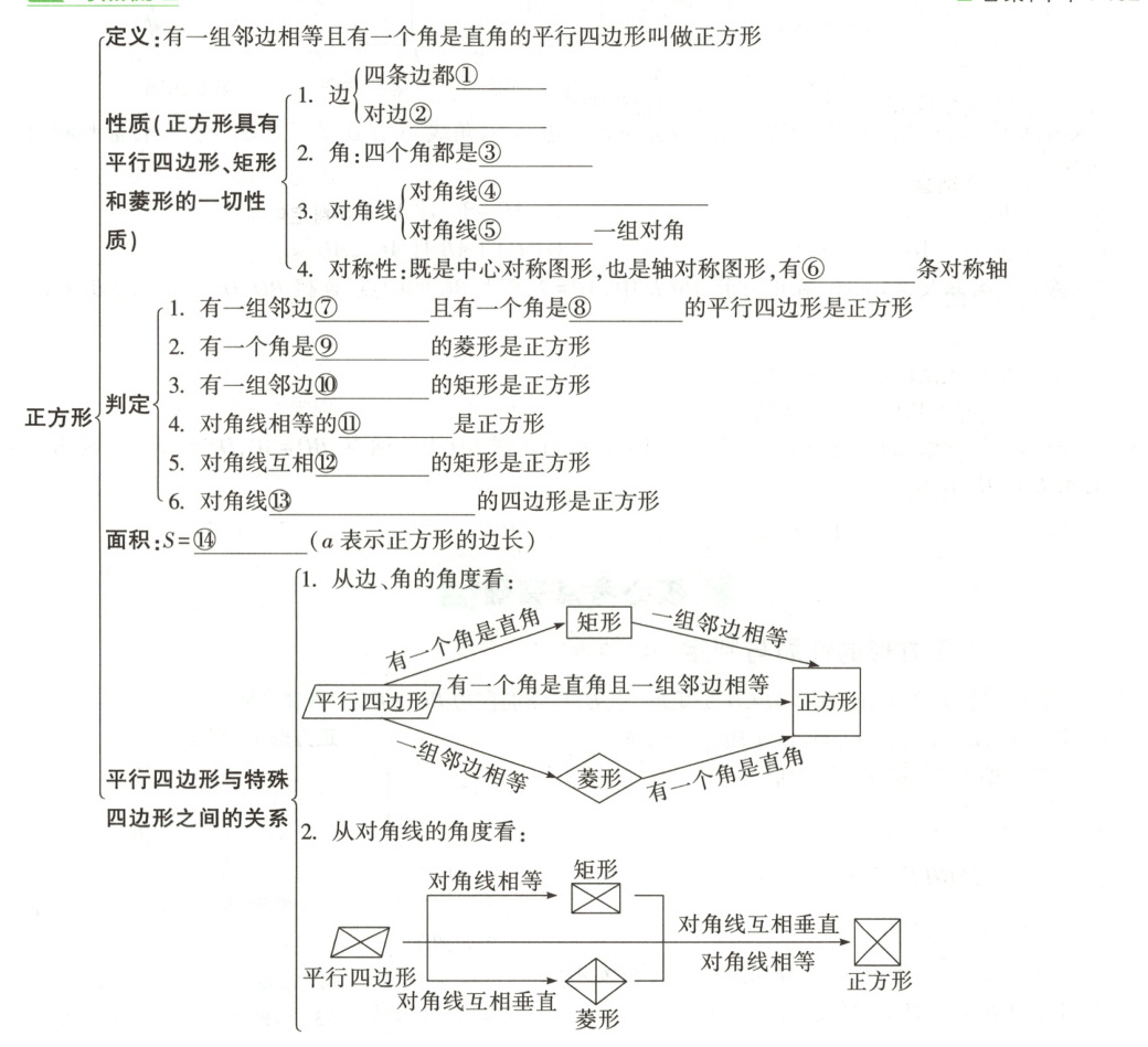 ①相等 ②平行 ③直角 ④相等且互相垂直平分 ⑤平分 ⑥4 ⑦相等 ⑧直角 ⑨直角 ⑩相等 ⑪菱形 ⑫垂直 ⑬相等且互相垂直平分 ⑭a²