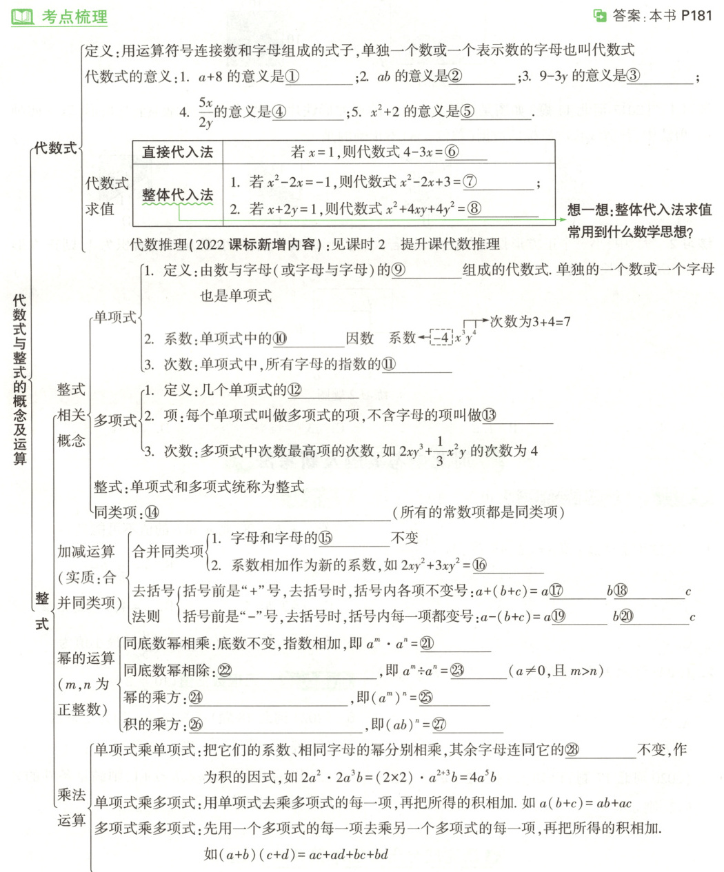 ①a与8的和;②a与b的积;③9减去3与y的积;④5x除以2y的商;⑤x的平方与2的和;⑥1;⑦2;⑧1;⑨积;⑩数字;⑪和;⑫和;⑬常数项;⑭所含字母相同,并且相同字母的指数也相同的项;⑮指数;⑯5xy²;⑰+;⑱+;⑲-;⑳-;㉑a^(m+n);㉒底数不变,指数相减;㉓a^(m-n);㉔底数不变,指数相乘;㉕a^(mn);㉖积的乘方等于把积的每一个因式分别乘方,再把所得的幂相乘;㉗a^n b^n;㉘指数;㉙(a+b)(a-b)=a²-b²;㉚(a±b)²=a²±2ab+b²;㉛9xy;㉜m(a+b+c);㉝(a+b)(a-b);㉞(a±b)²;整体思想。