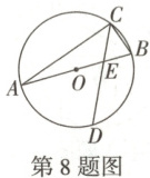 8. (冀教九上习题改编)如图,$\triangle ABC$内接于$\odot O$,$AB$是$\odot O$的直径,$D$是$\overset{\frown}{AB}$的中点,连接$CD$,交$AB$于点$E$。若$AE=12$,$DE=4\sqrt{5}$,则$OE$的长为(