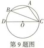 9. 如图,$\triangle ABC$内接于$\odot O$,$AB=AC$,$CD$是$\odot O$的直径,若$\angle BCD=20^{\circ}$,则$\angle ABC$的度数为(