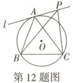 12. (人教九上复习题改编)如图,$\triangle ABC$内接于$\odot O$,过点$A$作$\odot O$的切线$l$,在$l$上任取一点$P$(异于点$A$),连接$PB$,$PC$,则$\angle BPC$