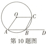 10. (北师九下想一想改编)如图,$AB$,$BC$为$\odot O$的两条弦,连接$OA$,$OC$,点$D$为$AB$的延长线上一点,若$\angle CBD=62^{\circ}$,则$\angle AOC$的度数为(