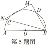 5. 如图,一个零刻度落在点$A$的量角器(半圆$O$),其直径为$AB$,一等腰直角三角板$MNB$绕点$B$旋转,斜边$BN$交半圆$O$于点$C$,$BM$交半圆$O$于点$D$,点$C$在量角器上的读数为$\alpha$. 关于结论Ⅰ,Ⅱ,下列判断正确的是(