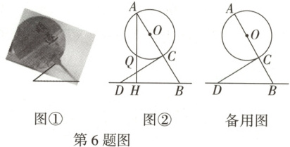 6. (2025 唐山模拟)漆扇属于国家级非物质文化遗产,它利用了漆不溶于水的特点制作而成,淇淇把自己制作的圆形漆扇放在支架上,如图①所示. 图②是其平面示意图,$AC$为圆形漆扇的直径,点$O$为圆心,扇柄$BC = 10\ cm$,且$A,O,C,B$在同一直线上,$\triangle BCD$为支架,$DC$与$\odot O$相切于点$C$,$BD = 20\ cm$,点$A$到桌面的距离为$AH$,且$AH$与$\odot O$相交于点$Q$,点$B$与$H$的距离$BH = 13\ cm$.