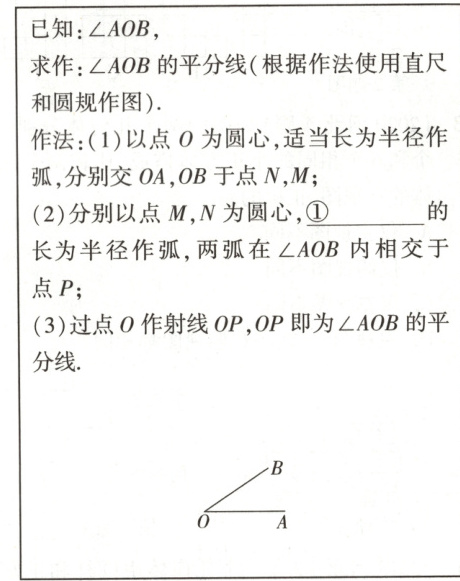 长为半径作弧,交 $O'A$ 于点 $M$,可得到 $O'M = OP$;(4)以点 $M$ 为圆心,②