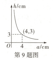 9. 当三角形面积一定时,它的底边长$a(cm)$与底边上的高$h(cm)$成反比例函数关系,其图象如图所示,则当底边长$a(cm)$满足$1.2 < a < 2.4$时,底边上的高$h(cm)$的取值范围是 (