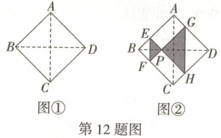 12. 如图,将正方形纸片$ABCD$的$\angle B$和$\angle D$进行折叠,使两个直角的顶点重合于对角线$BD$上的点$P$处,$EF$,$GH$分别是折痕,若点$P$沿$BD$从点$B$向点$D$移动,则阴影部分的周长(