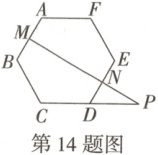 14. 如图,正六边形$ABCDEF$的边长为$6$,$M$,$N$分别为$AB$,$DE$边的中点,连接$MN$并延长交$CD$的延长线于点$P$,则$NP$的长为