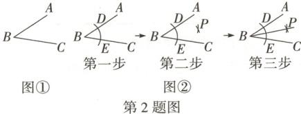 2. (2020河北6题)如图①,已知 $\angle ABC$,用尺规作它的角平分线。