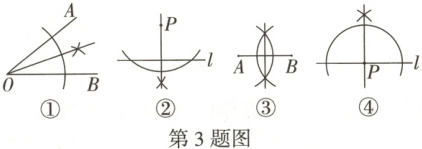 3. (2018河北6题)尺规作图要求:Ⅰ. 过直线外一点作这条直线的垂线;Ⅱ. 作线段的垂直平分线;Ⅲ. 过直线上一点作这条直线的垂线;Ⅳ. 作角的平分线。