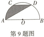 9. 如图,点 C,D 是以 AB 为直径的半圆上的三等分点,⌢CD 的长为$\frac{2}{3}π,$则图中阴影部分的面积为(