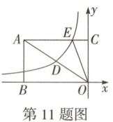 11. 万唯原创 如图,在平面直角坐标系中,矩形ABOC的顶点B,C分别在x轴,y轴上,反比例函数$y=\frac{k}{x}$(k≠0)的图象与矩形的对角线AO交于点D,与边AC交于点E,且点D是AO的中点,连接OE,若△AEO的面积为9,则k的值为(