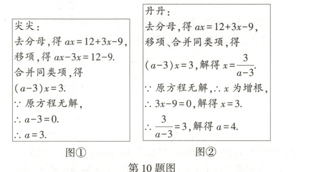10. 新考法 注重过程性学习 若关于x的方程$\frac{ax}{3x - 9}=\frac{12}{3x - 9}+1$无解,求a的值.尖尖和丹丹的做法如图①和图②所示.下列说法正确的是(