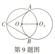 9. 如图,分别以O₁,O₂为圆心,线段O₁O₂的长为半径画圆,两圆相交于A,B两点,点C为⊙O₁上一点,则∠ACB的度数为(