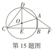 15. 如图,圆内接四边形 ABCD 的对角线 AC 是⊙O 的直径,连接 DO 并延长交 CB 于点 E,且 DE⊥CB,延长 DA,CB 交于点 F.