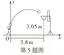 5. (8分)某校学生为了参加学校组织的“投篮大赛”,利用课后时间积极地进行备赛训练.如图,在平面直角坐标系中,一个单位长度代表$1m$长,小明从$(0,2)$处将篮球投出,篮球的轨迹示意图可近似看作抛物线$C:y=a(x-2.5)^{2}+3.25$的一部分,篮筐距小明水平距离为$3.8m$,篮筐中心到地面的距离为$3.05m$.