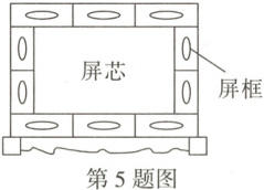 5. (人教九上习题改编)屏风历史悠久,是中国古代居室内的重要家具和装饰品,具有分隔、美化、挡风等作用. 如图是一个屏芯长 80 cm,宽 60 cm 的矩形小座黄花木屏风示意图,屏芯周围被边框宽度相同的屏框包围,且整个屏风的面积为 $6300\ cm^{2}$(不包括底座),设屏框的宽度为 $x$ cm,根据题意可列方程