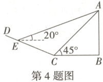 4. (8分)某数学兴趣小组计划测量一个5G通讯塔(通讯塔底部不可到达)的高$AB$.如图,他们在坡底$C$处测得塔顶$A$的仰角为$45^{\circ}$,沿坡比为$1:2.4$的斜坡$CD$前行26m到达$E$处,在$E$处测得塔顶$A$的仰角为$20^{\circ}$.已知$AB\perp BC$,图中所有点在同一平面内,求该5G通讯塔的高$AB$.(结果取整数.参考数据:$\sin20^{\circ}\approx0.34$,$\cos20^{\circ}\approx0.94$,$\tan20^{\circ}\approx0.36$)