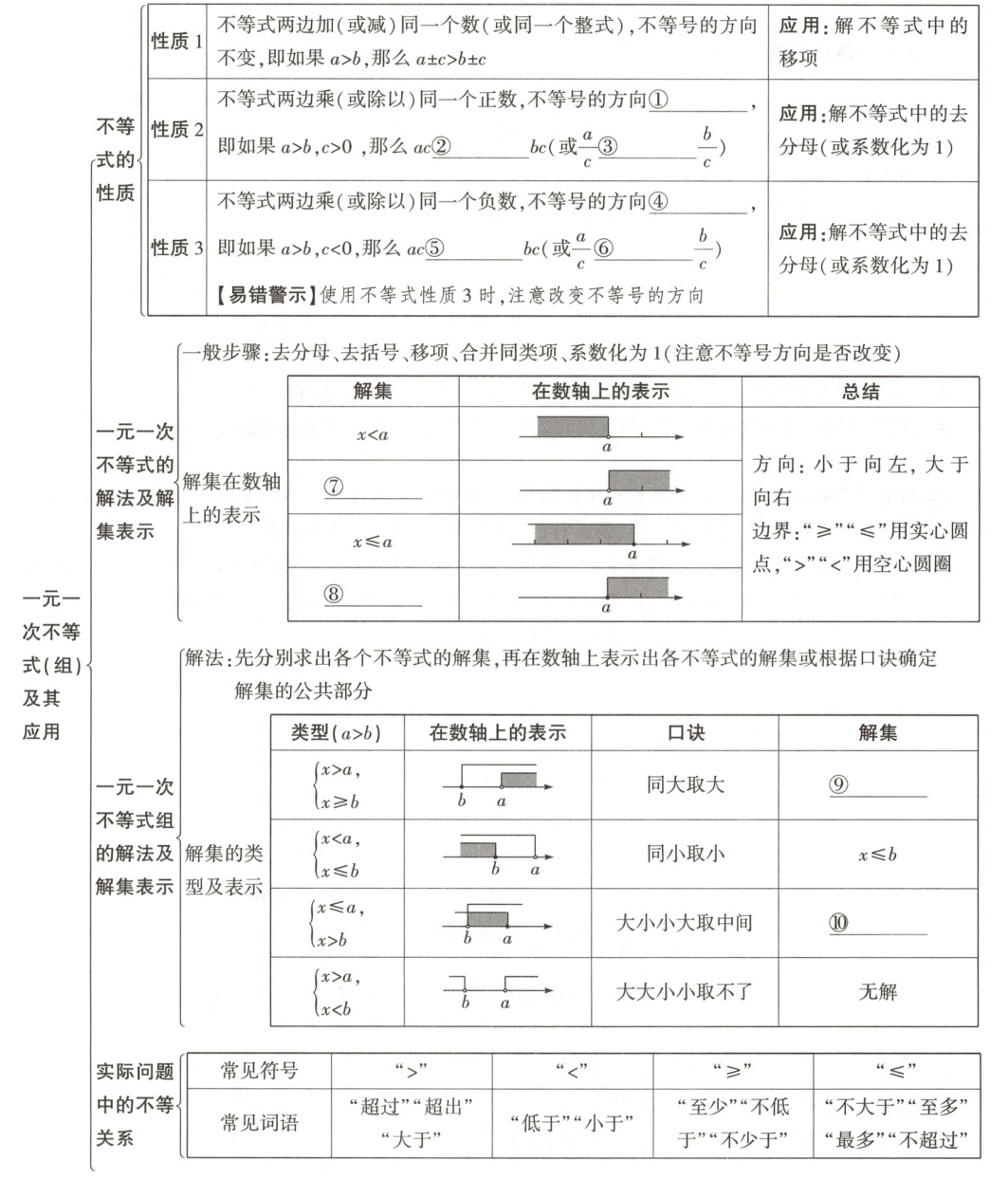 ①不变;②>;③>;④改变;⑤<;⑥<;⑦$x > a$;⑧$x \geq a$;⑨$x > a$;⑩$b < x \leq a$
