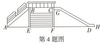 4. (8分)万唯原创 如图是某公园的滑梯示意图,$AB$为台阶,$CH$为滑道,立柱$BE,CF$长度相等,且垂直于地面$AD$,已知$AB$与地面$AD$的夹角为$40^{\circ}$,滑道$CH$由一段平行于地面的滑道$CG$、坡度为$1:1.5$的滑道$DG$和与地面重合的滑道$DH$组成,若$AE = 2.5m,CG = DH = 0.5m$,求滑道底部点$H$与立柱$CF$之间的距离.(参考数据:$\sin40^{\circ}\approx0.64,\cos40^{\circ}\approx0.77,\tan40^{\circ}\approx0.84$)