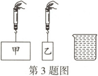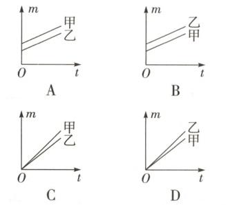 3. 万唯原创 设物体浸入水中的体积为$V$,水的密度为$\rho$,则该物体排开水的质量$m=\rho· V$,如图,分别将甲、乙两个长方体铁块(甲的体积$>$乙的体积)按照同样的速度匀速浸入装满水的烧杯中,则从铁块底面接触水开始一段时间里,两个铁块各自排开水的质量$m$随时间$t$变化的图象是(