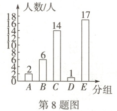 8. (2025黑白卷)某校就“每周在校体育锻炼时间”的问题抽取了一部分中学生调查,并将调查结果绘制成如图的统计图. 其中分组:$ A $组:$ 5 \leqslant h < 6 $;$ B $组:$ 6 \leqslant h < 7 $;$ C $组:$ 7 \leqslant h < 8 $;$ D $组:$ 8 \leqslant h < 9 $;$ E $组:$ 9 \leqslant h \leqslant 10 $($ h $为每周在校锻炼时间,单位:小时). 若第二周$ A $组学生的锻炼时间均不小于6小时,其他学生的锻炼时间不变,且使新的结果的中位数一定与原来的中位数所在组相同,则第二周$ D $组的学生数最多为 (