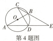 4.(8分)如图,$AB$是$\odot O$的直径,$CD$是$\odot O$的弦,且$\overset{\frown}{CB}=\overset{\frown}{BD}$,连接$AD$并延长,与$CB$的延长线交于点$E$,且$\angle E=\angle DCE$.