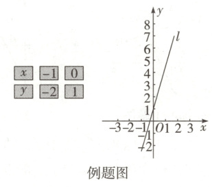 例(2020河北24题改编)表格中的两组对应值满足一次函数$y = kx + b$,现画出了它的图象为直线$l$,如图,某同学为观察$k$,$b$对图象的影响,将上面函数中的$k$与$b$交换位置后得另一个一次函数,设其图象为直线$l'$。