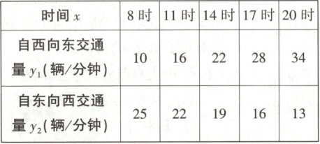 例 新考法 跨物理学科 (2025保定模拟)某条东西方向道路双向共有三条车道,在早晚高峰经常会拥堵,某数学小组对该路段的交通量(辆/分钟)和时间进行了统计和分析,相应数据如下表所示,并发现交通量和时间的变化规律符合一次函数的特征,其中 $ y_2 = -x + 33 $。