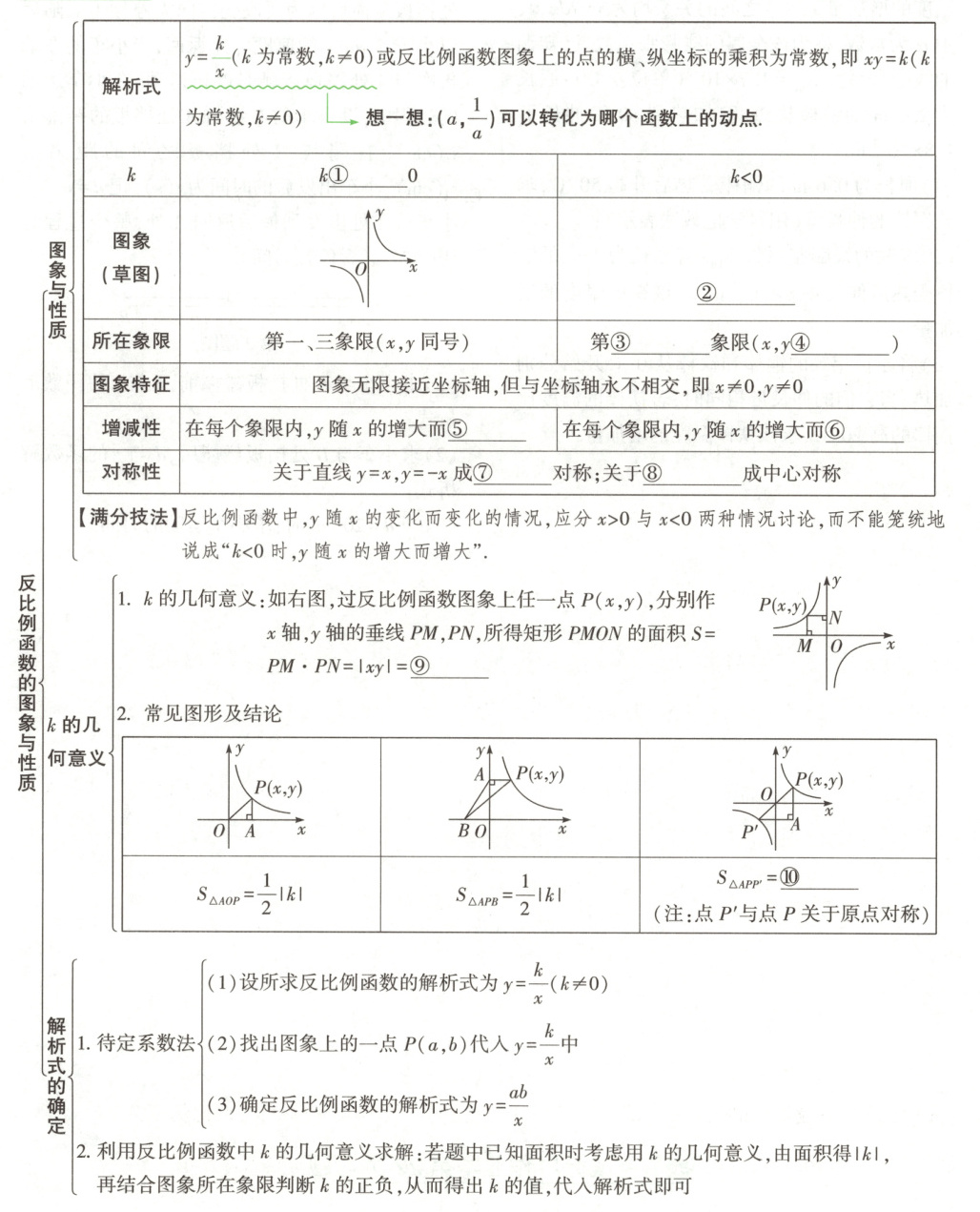①>;②第二、四象限的双曲线;③二、四;④异号;⑤减小;⑥增大;⑦轴;⑧原点;⑨|k|;⑩|k|