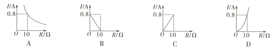 9. 新考法 跨物理学科 (冀教九上习题改编)嘉淇学习了物理中的欧姆定律发现:电阻两端的电压 $ U = $电流强度 $ I × $电流通过的电阻 $ R $. 当某滑动变阻器两端电压恒定,电阻调节为 $ 10 \Omega $时,测得通过该变阻器的电流为 $ 0.8 A $,则通过该滑动变阻器的电流 $ I $(单位:$ A $)与电阻 $ R $(单位:$ \Omega $)之间的函数关系图象大致是(