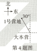 4. 某校八年级师生到郊外进行夏令营活动,在营地驻扎时要求 1、2 号营地到大本营的距离相等,且 2 号营地要在 1 号营地的正东方向,如图,若 1 号营地在大本营的北偏西 $ 30^{\circ} $ 方向,则 2 号营地在大本营的(