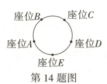 14. 某课题研究小组成员由一名组长和四名组员(两男两女)组成。某次研讨会上,组长选择座位 $ E $ 就座,四名成员随机选择剩余座位落座,座位分布如图所示,则两名女组员座位相邻的概率为