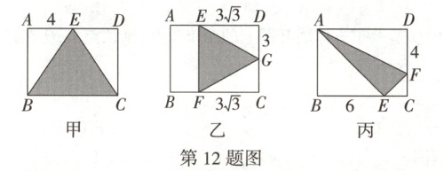 12. 万唯原创 在矩形 $ ABCD $ 中,$ AB = 6 $,$ BC = 8 $,要求在矩形 $ ABCD $ 内部画出一个三角形,使得其一边上的中线等于这条边的一半。甲、乙、丙分别画出了如图所示的三角形(阴影部分),则符合作图要求的是(