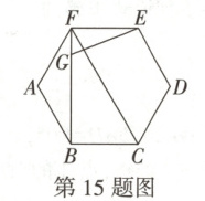 15. 如图,$ G $ 是正六边形 $ ABCDEF $ 对角线 $ BF $ 上一点,且 $ BG = 3FG $,连接 $ FC $,$ EG $,若 $ \triangle EFG $ 的面积为 1,则 $ \triangle FBC $ 的面积为