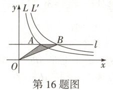16. 万唯原创 双曲线 $ L: y = \frac{6}{x}(x > 0) $ 如图所示,小李设计了一个程序:对于数对 $ (a,b) $ 表示输入两个正数 $ a $,$ b $,可得双曲线 $ L': y = \frac{ab}{x}(x > 0) $,直线 $ l: y = 2 $ 分别与双曲线 $ L $,$ L' $ 交于点 $ A $,$ B $(点 $ B $ 与点 $ A $ 不重合),连接 $ OA $,$ OB $,若 $ S_{\triangle AOB} < 2.5 $,则线段 $ AB $ 上横坐标为正整数的点(不含端点)最多有