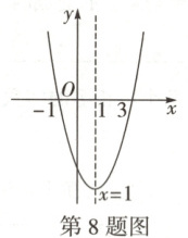 8. (人教九上习题改编)如图,抛物线$y = ax^{2}+bx + c$,其对称轴为直线$x = 1$。根据图象,分析并判断下列结论,用“$>$”“$\geqslant$”“$<$”“$\leqslant$”或“$=$”填空。