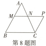 8. (2024邯郸模拟)如图,在$\triangle ABC$中,$M,N$分别是边$AB,AC$上的点,延长$MN$至点$P$,连接$PC$,$\angle P + \angle BCP = 180°$,要使四边形$MBCP$为平行四边形,甲、乙、丙三名同学给出三种不同的方案: