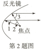 2. 新考法 跨物理学科 (2025黑白卷)汽车大灯通常由灯泡、反光镜和配光镜三部分组成,如图,光源位于焦点处,光线经反射后平行于地面射出. 若$\angle 1 = 20^{\circ}$,$\angle 3 = 56^{\circ}$,则$\angle 2$的度数为(