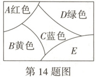 14. 万唯原创 将一个矩形分割成 $ A,B,C,D,E $ 五个区域,用红、黄、蓝、绿四种不同的颜色分别给这五个区域着色,已着色情况如图所示,若给 $ E $ 区域着色后(颜色可重复使用),使每相邻两个区域的着色都不相同的概率为