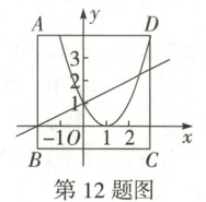 12. (2025 样卷)如图,正方形 $ ABCD $ 的顶点坐标分别为 $ A(-2,4),B(-2,-1),C(3,-1) $. 抛物线经过点 $ D $,顶点坐标为 $ (1,0) $,将此抛物线在正方形 $ ABCD $ 内(含边界)的部分记为图象 $ G $. 若直线 $ y = kx - 2k + 2(k ≠ 0) $ 与图象 $ G $ 有唯一交点,则 $ k $ 的取值范围是 (