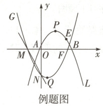 例 一题多设问 如图,抛物线 $ L:y = -\dfrac{1}{4}x^{2} + bx + c $ 过点 $ (2,4) $,点 $ (0,1) $,顶点为点 $ P $,与 $ x $ 轴交于点 $ A,B $(点 $ A $ 在点 $ B $ 的左侧).抛物线 $ G:y = \dfrac{1}{4}x^{2} + (1 - m)x - 4m $ 的顶点为点 $ Q $,与 $ x $ 轴交于点 $ M,F $,点 $ F $ 在 $ M $ 的右侧,与 $ y $ 轴交于点 $ N $,已知 $ m > 1 $.