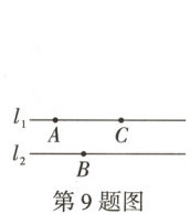 9. 万唯原创 如图,直线$l_{1}// l_{2}$,它们之间的距离为 2,A,C 是直线$l_{1}$上的两个定点,且$AC = 4$,B 是直线$l_{2}$上一动点,在同一平面内找一点 D,使得四边形 ABCD 是平行四边形,当点 D 与点 C 之间的距离最小时,$∠BDC$的度数为(