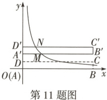 11. 万唯原创 如图,矩形 ABCD 中,点 A 与原点 O 重合,点 B 在 x 轴上,点$D(0,1)$,将矩形 ABCD 沿 y 轴向上平移$a(a>0)$个单位长度,得到矩形$A'B'C'D'$,边$A'B'$,$C'D'$分别与双曲线$y=\frac{6}{x}(x>0)$交于点 M,N,若点 M,N 之间的水平距离 d 满足$1≤d≤3$,则 a 的取值范围为(