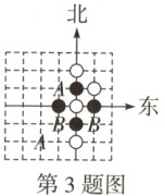 3. 如图,老师让同学利用棋子在棋盘上拼出一个中心对称图形(颜色忽略),为了增加难度,加入了方向角,则下一个棋子应该放在中心点的(