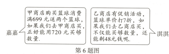 6. 嘉嘉和淇淇准备用 720 元班费给班里买一定数量的篮球,已知甲、乙两个商店某种品牌的篮球标价相同,如下图是嘉嘉和淇淇了解到的具体情况:
