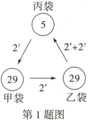 1. 如图,在甲、乙、丙三只袋中分别装有球29个、29个、5个,先从甲袋中取出$2^{x}$个球放入乙袋,再从乙袋中取出$(2^{x}+2^{y})$个球放入丙袋,最后从丙袋中取出$2^{y}$个球放入甲袋,此时三只袋中球的个数都相同,则$2^{x+y}$的值等于(