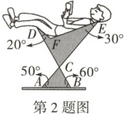 2. (2021河北18题)如图是可调躺椅示意图(数据如图),$ AE $与$ BD $的交点为$ C $,且$ \angle A,\angle B,\angle E $保持不变. 为了舒适,需调整$ \angle D $的大小,使$ \angle EFD = 110^{\circ} $,则图中$ \angle D $应