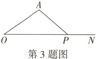 3. 如图,已知点$ P $是射线$ ON $上一动点(不与点$ O $重合),$ \angle O = 30^{\circ} $,若$ \triangle AOP $为钝角三角形,则$ \angle A $的取值范围是 (
