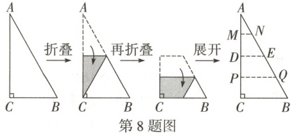 8. (2025长春)将直角三角形纸片$ABC(\angle C = 90^{\circ})$按如图方式折叠两次再展开,下列结论错误的是(